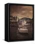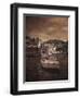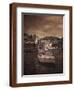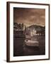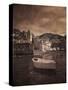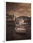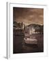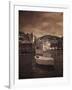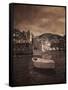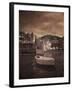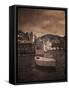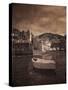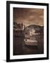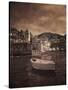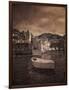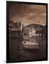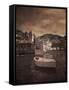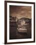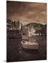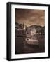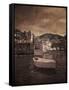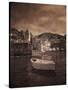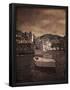 Italy, Vernazza. Infrared image of a boat in the harbor of Vernazza with the church in background. Photo Print