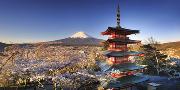 Japan, Yamanashi Prefecture, Fuji-Yoshida, Chureito Pagoda and Mt Fuji During Cherry Blossom Season