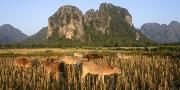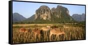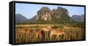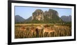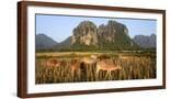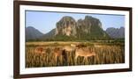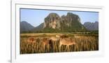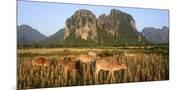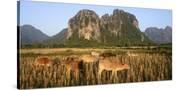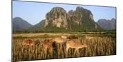 Laos, Vang Vieng. Cows in Front of Limestone Karst at Sunrise Photo Print