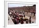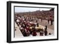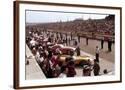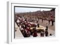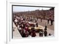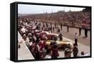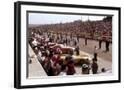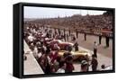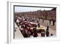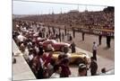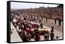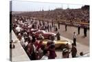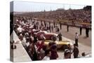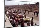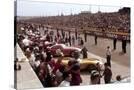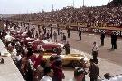 Le Mans racing circuit France The cars are lined up in the pits with the spectator stands opposite them full of people Bridgeman Images