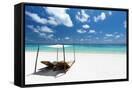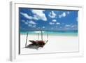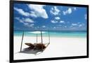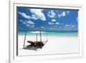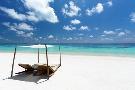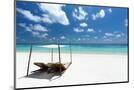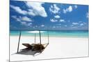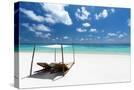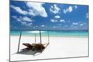 Lounge chairs on tropical white sandy beach, The Maldives, Indian Ocean, Asia