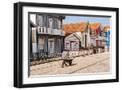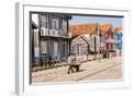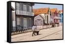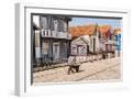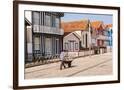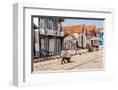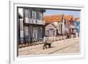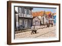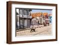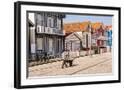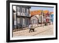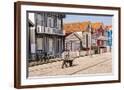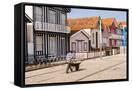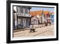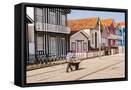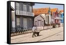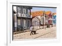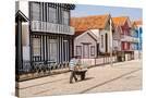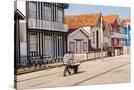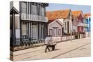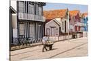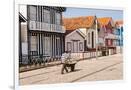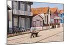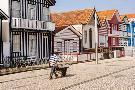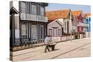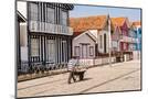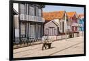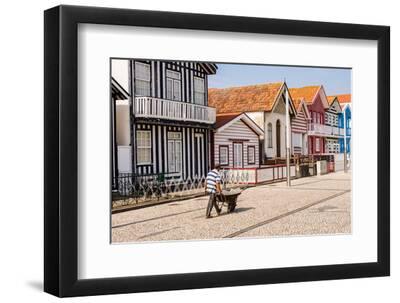 Man in a striped shirt wheeling a wheelbarrow, Bairro dos Pescadores, Aveiro, Portugal