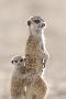 Meerkat (Suricata suricatta) adult, alert sentinel, with baby, Kalahari
