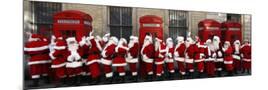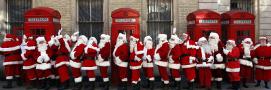 Men from the London Santa School, Dressed in Christmas Outfits, Pose by Telephone Boxes in London