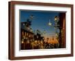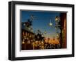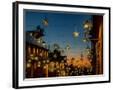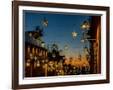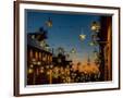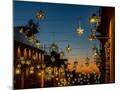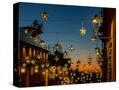 Mexico, San Miguel de Allende. Lighted stars suspended over a street at sunset.