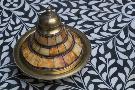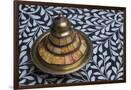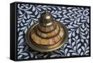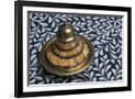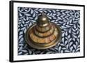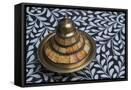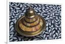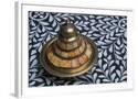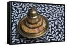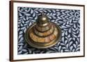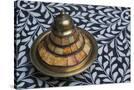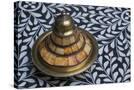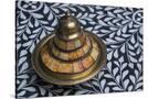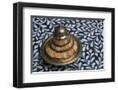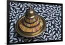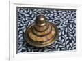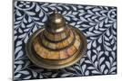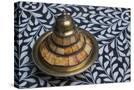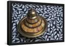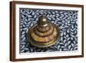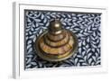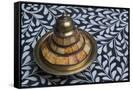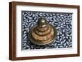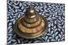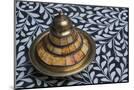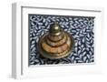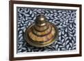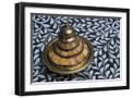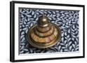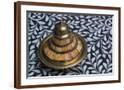 Morocco, Fes. A covered brass bowl with inlay of camel bone sites on a stone inlay table in a shop. Premium Photo Print