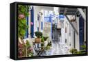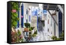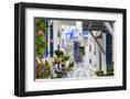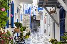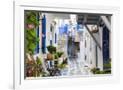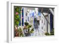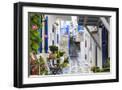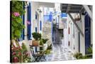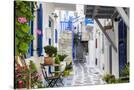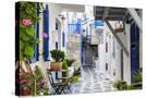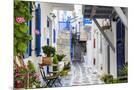 Narrow street, whitewashed buildings with blue paint work, flowers, Mykonos Town (Chora), Mykonos,