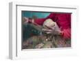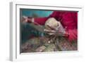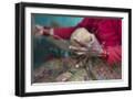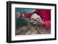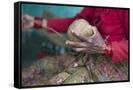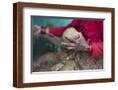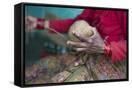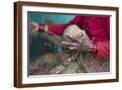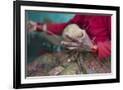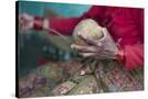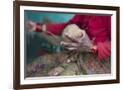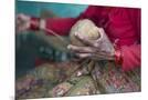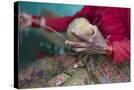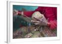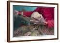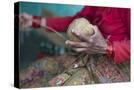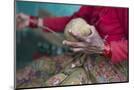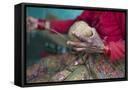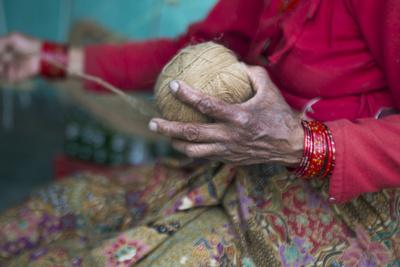 Nepal. Nepali weaving woman, posing and weaving threads for carpets. Nayapati, Eastern Kathmandu. Photo Print