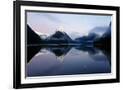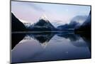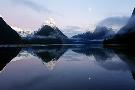 New Zealand, Nuova Zelanda, Fiordland, Milford Sound and Moon During a Cold and Misty Sunrise.