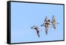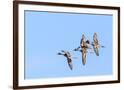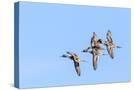 Northern pintail ducks in courtship flight at Freezeout Lake WMA near Fairfield, Montana, USA