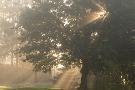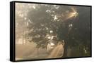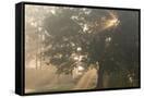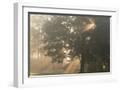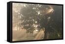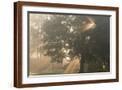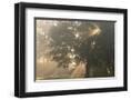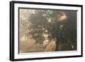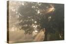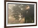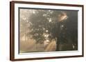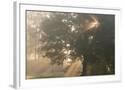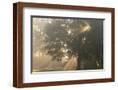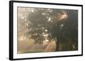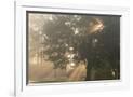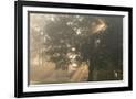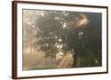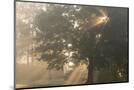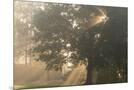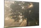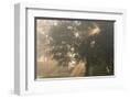 Oak tree with sun rays in misty morning Photo Print