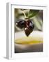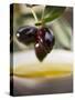 Olive Sprig with Black Olives over Bowl of Olive Oil