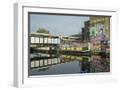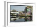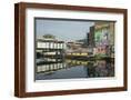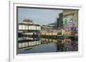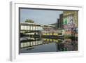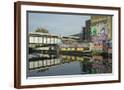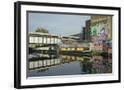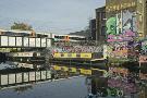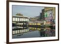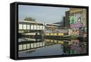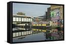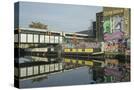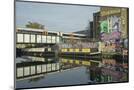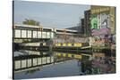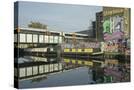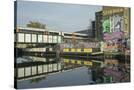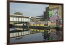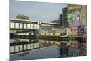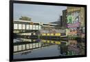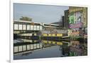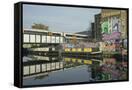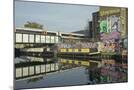 Overground train drives past canal by artists studios and warehouses in Hackney Wick, London, Engla