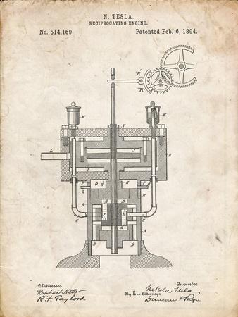 PP1094-Vintage Parchment Tesla Reciprocating Engine Poster Giclee Wall Art