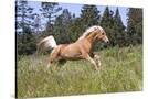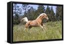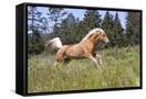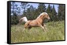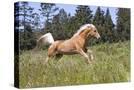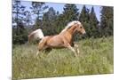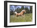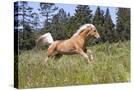 Palomino Quarter Horse Running Through Meadow at Forest Edge, Fort Bragg, California, USA