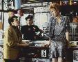 Molly Ringwald as Andie and Jon Cryer as Duckie and Annie Potts as Iona in Pretty in Pink. In record store