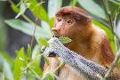 Proboscis monkey (Nasalis larvatus) female feeding, Kinabatangan River, Sabah, Borneo.