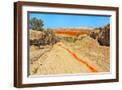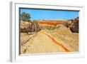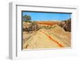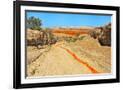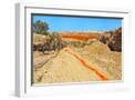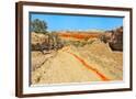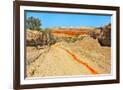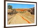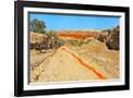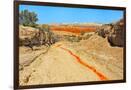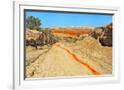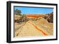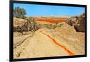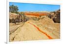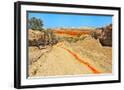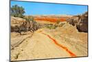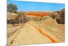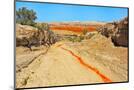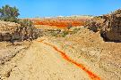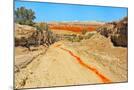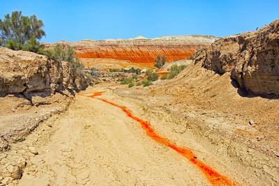 Red clay soil carried down by water, Aktau Mountain, Altyn-Emel National Park, Kazakhstan