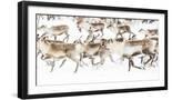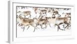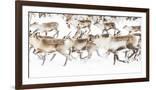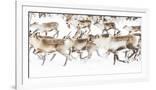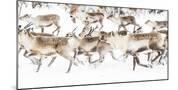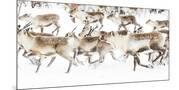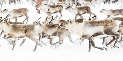 Reindeer herded by Sami people running fast in the white landscape during a snowfall, Lapland, Sweden, Scandinavia, Europe