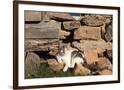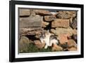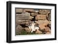 Romania, Maramures County, Dobricu Lapusului. Cat leaning against stone wall.
