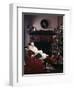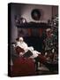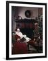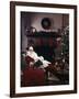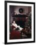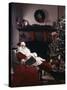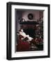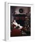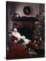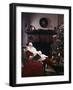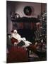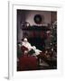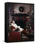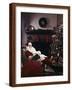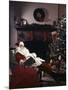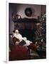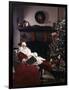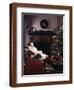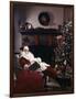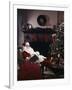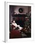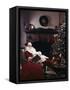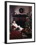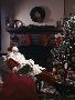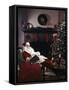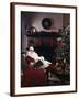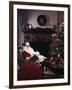 SANTA CLAUS ASLEEP IN CHAIR IN FRONT OF CHRISTMAS TREE AND FIREPLACE INDOOR Photo Print