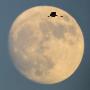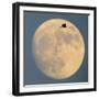 Sandhill crane (Antigone canadensis) flying against moon, Soccoro, New Mexico, USA