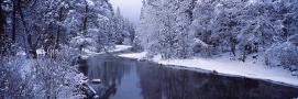 Snow Covered Trees Along a River, Yosemite National Park, California, USA