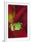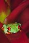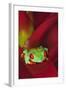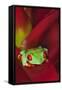 South America, Panama. Red-eyed tree frog on bromeliad flower.
