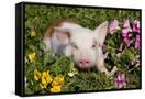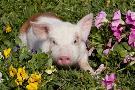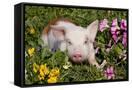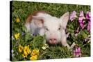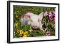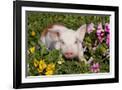 Spotted Piglet in Grass, Pink Petunias, and Yellow Pansies, Dekalb, Illinois, USA
