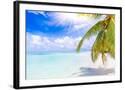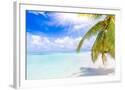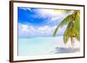 Summer vacation background with tropical beach with rays of sun light and leaf palm. Exotic landsca