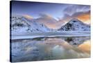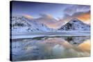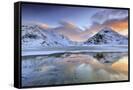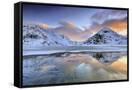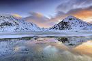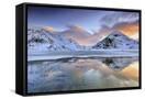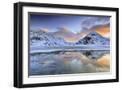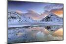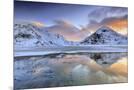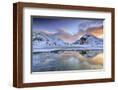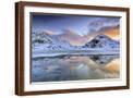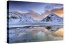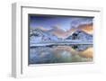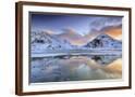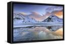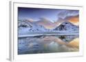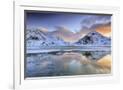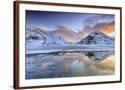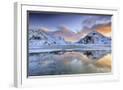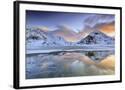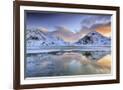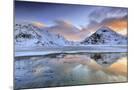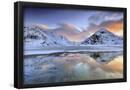 Sunrise on Uttakleiv Beach Surrounded by Snow Covered Mountains Reflected in the Cold Sea Photo Print