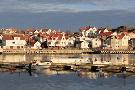 Sweden, Bohuslan, Island of Tjorn. Views over Skarhamn fishing village's rooftops, town and harbor.