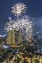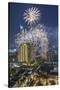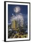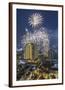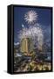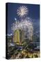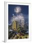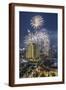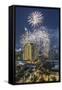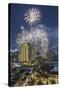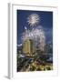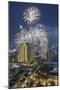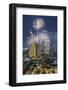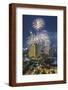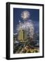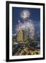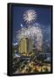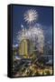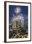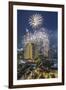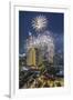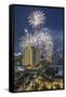 Thailand, Bangkok. Riverside, high angle skyline view with fireworks at dusk. Photo Print