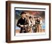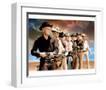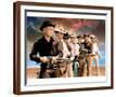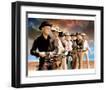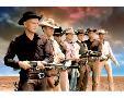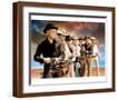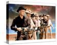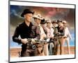 Yul Brynner as Chris Larabee Adams and Steve McQueen as Vin Tanner and Charles Bronson as Bernardo O'Reilly and James Coburn as Britt and Robert Vaughn as Lee and Horst Buchholz as Chico and Brad Dexter as Harry Luck in The Magnificent Seven. Guns drawn against sunset