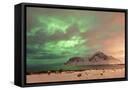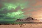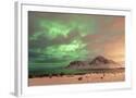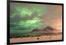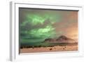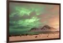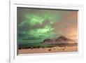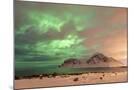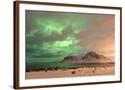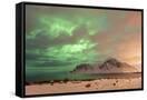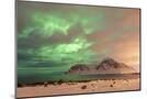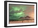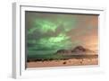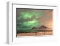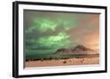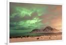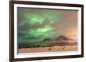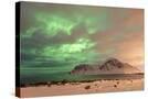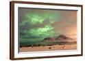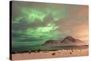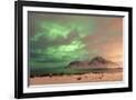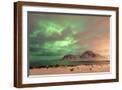 The Northern Lights (Aurora borealis) with mountain range in winter, Reine, Lofoten Islands
