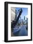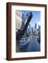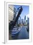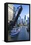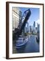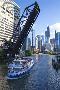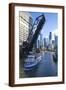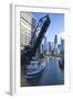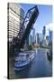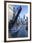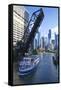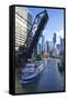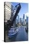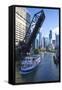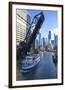 Tour Boat Passing under Raised Disused Railway Bridge on Chicago River, Chicago, Illinois, USA