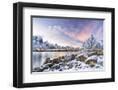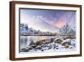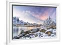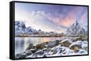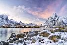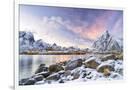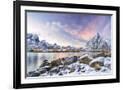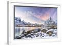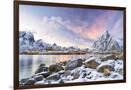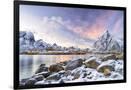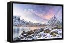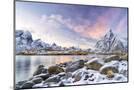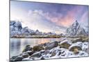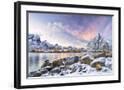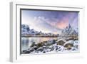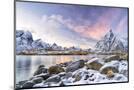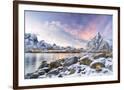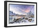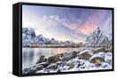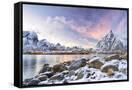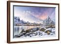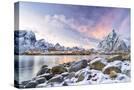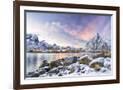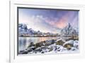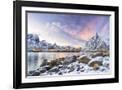 Traditional Rorbu in the fishing village of Sakrisoy at sunset in winter, Reine, Nordland county
