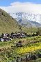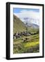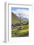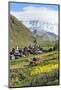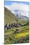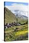 Traditional medieval Svanetian tower houses, Ushguli village, Shkhara Moutains behind, Svaneti regi