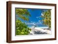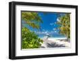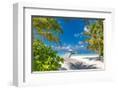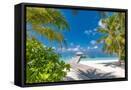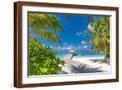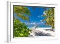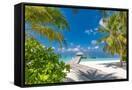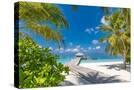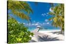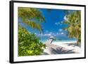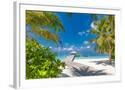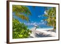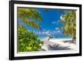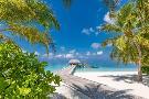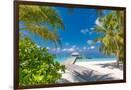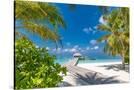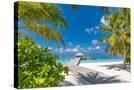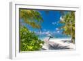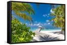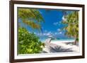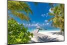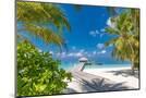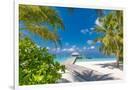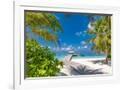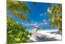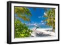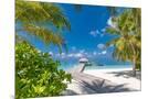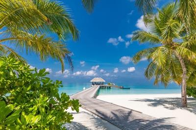 Tropical beach, Maldives. Jetty pathway into tranquil paradise island. Palm trees, white sand and b