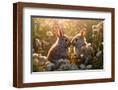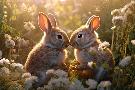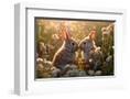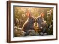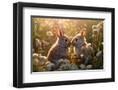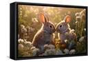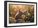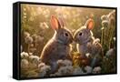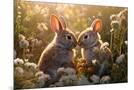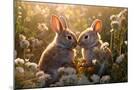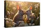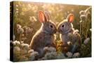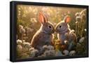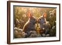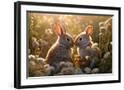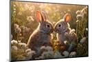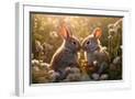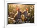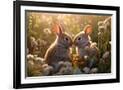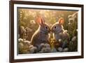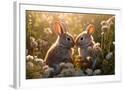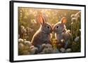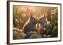 Two rabbits backlit amid flowers. AI Generated. Photo Print