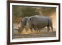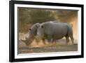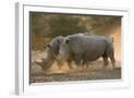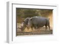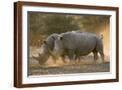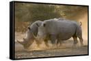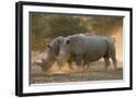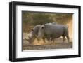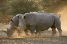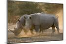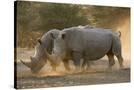 Two white rhinoceroses (Ceratotherium simum) walking in the dust at sunset, Botswana, Africa
