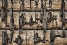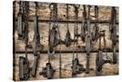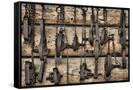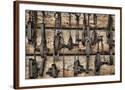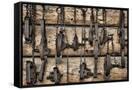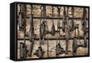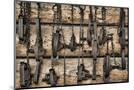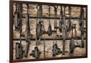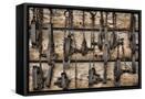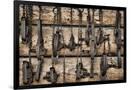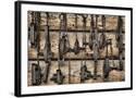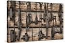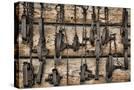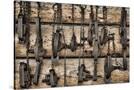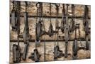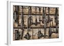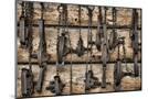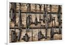 USA, Alaska. Collection of old traps hang on log cabin wall. Premium Photo Print
