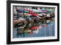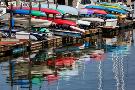 USA, California, San Diego. America's Cup Harbor, kayaks, boat rack, and reflections
