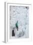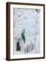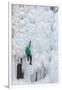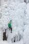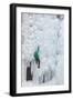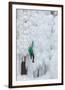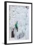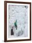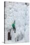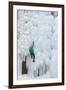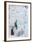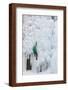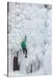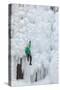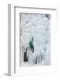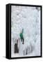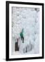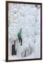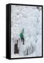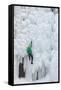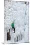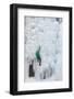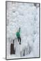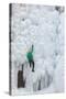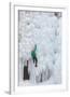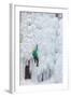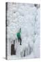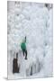 USA, Colorado, Uncompahgre National Forest. Climber ascends ice-encrusted cliff face.
