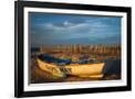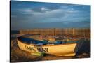 USA, New Jersey, Cape May National Seashore. Rowboat on beach sand at sunrise.