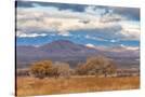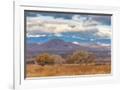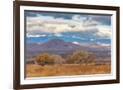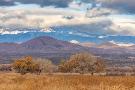 USA, New Mexico, Bosque Del Apache National Wildlife Refuge. Cottonwood trees and mountains.