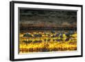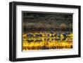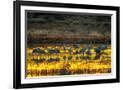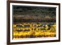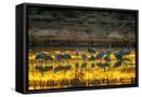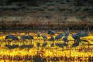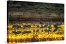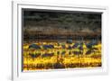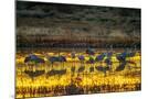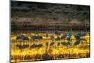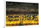 USA, New Mexico, Bosque Del Apache National Wildlife Refuge. Sandhill cranes in water at sunset.