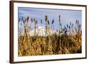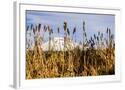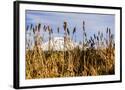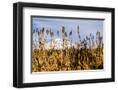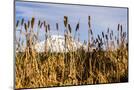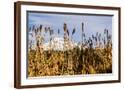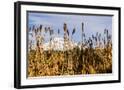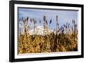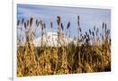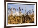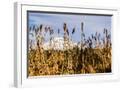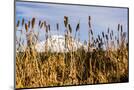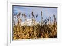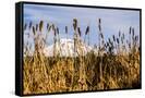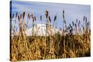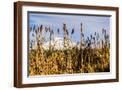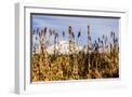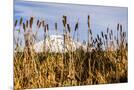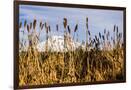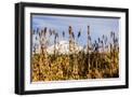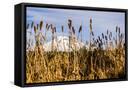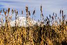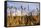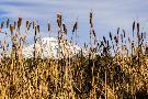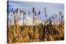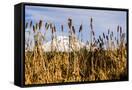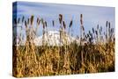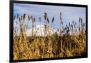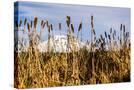 USA, Oregon. Lava Lake, cattails in foreground, Broken Top Mountain in background.