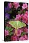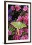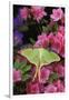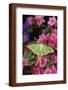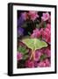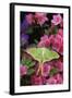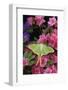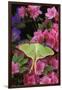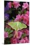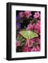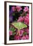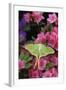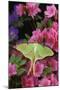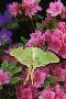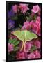 USA, Pennsylvania. Luna Moth on Pink Clematis