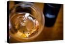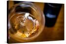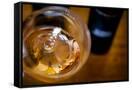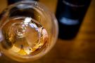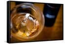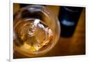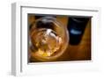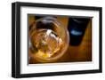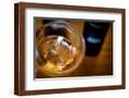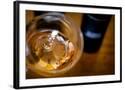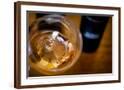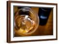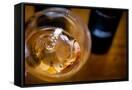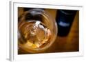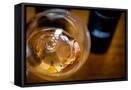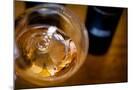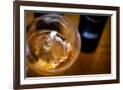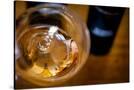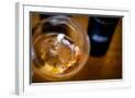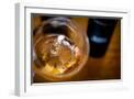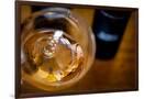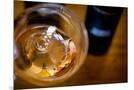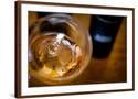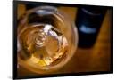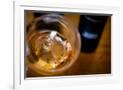 USA, Washington State, Seattle. Wine bottles are reflected in a glass of L'Orange, a Pinot Gris mad Photo Print